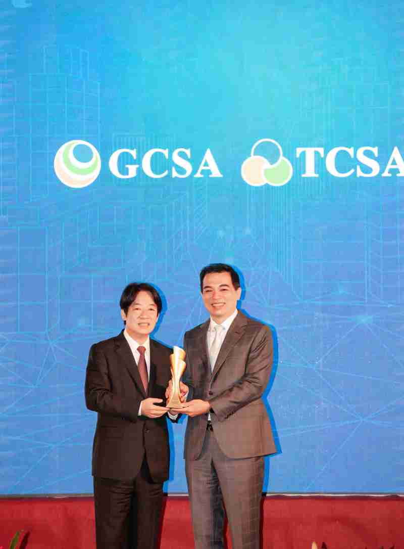 达全方位永续表现获全球永续奖及台湾永续奖肯定,,,,由副总统赖清德颁奖 (左),,龙门国际总经理柯富仁 (右) 代表领奖