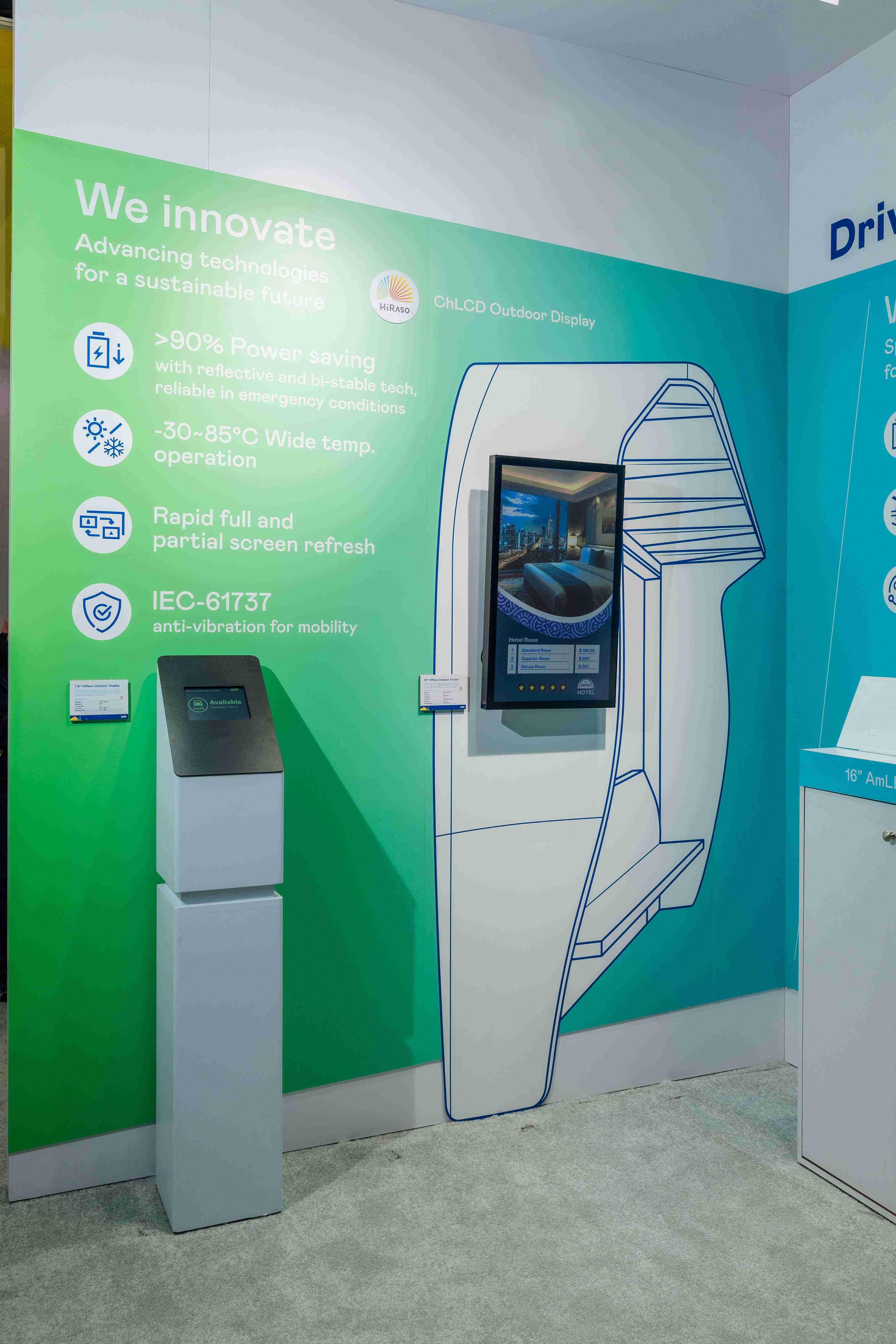 HiRaso胆固醇液晶显示器运用反射环境光线的方式,,,呈现影像显示时零耗能的环保省电诉求,,,,光线愈强愈能呈现绝佳的色彩饱和度及显示效果,,,,同时在摄氏-30度至85度间宽温的使用优势,,,为户外电子看板的新首选。。。。