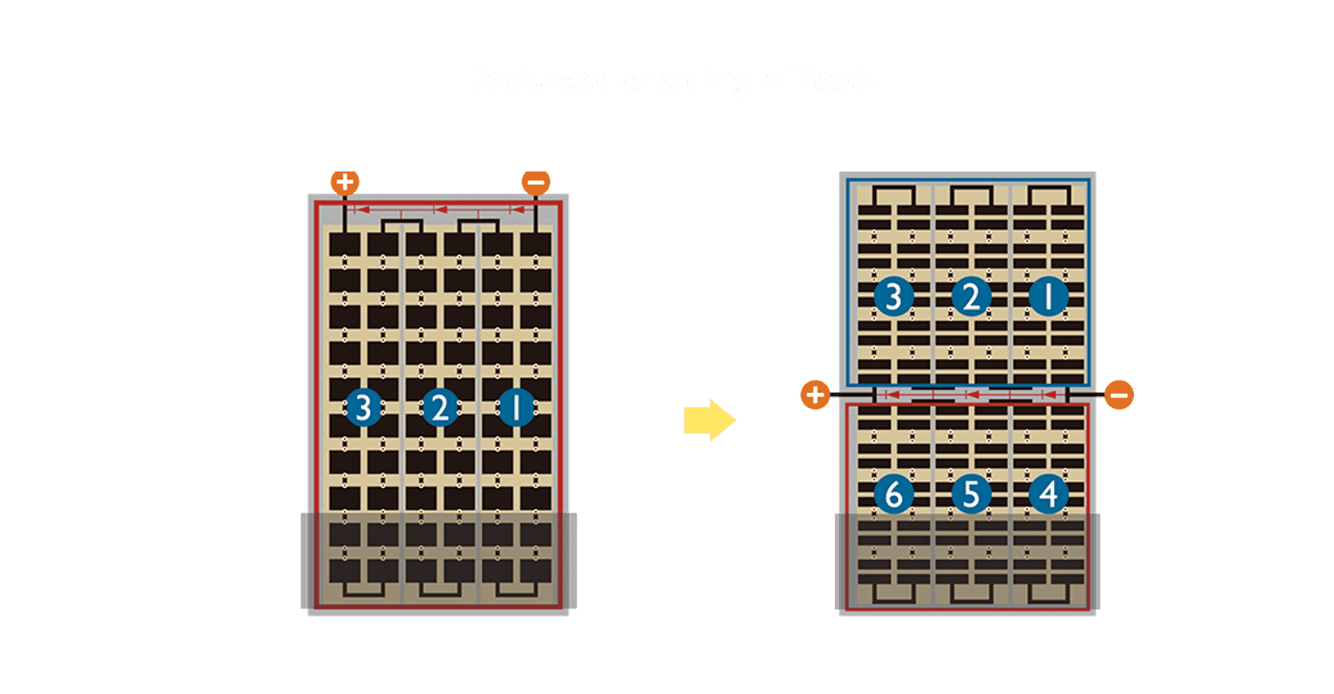 - 结合半切电池,,,降低遮阴影响、、、、提升模组抗隐裂能力、、、并减少电阻损耗,,,进一步提升模组发电效能。。。。
