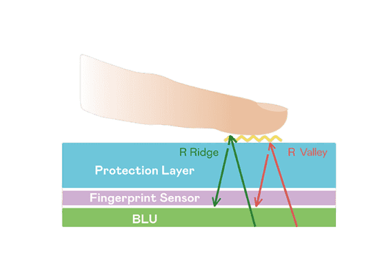TFT 指纹扫描感测技术利用薄膜电晶体 (TFT) 当作光感测元件,,,,藉由非晶硅 (a-Si) 与低温多晶硅(LTPS)既有光电转换特性对不同波段光源进行吸收,,使感测 IC 读取阵列感测元件的光漏电差异,,,,转换成数位灰阶影像。。。。